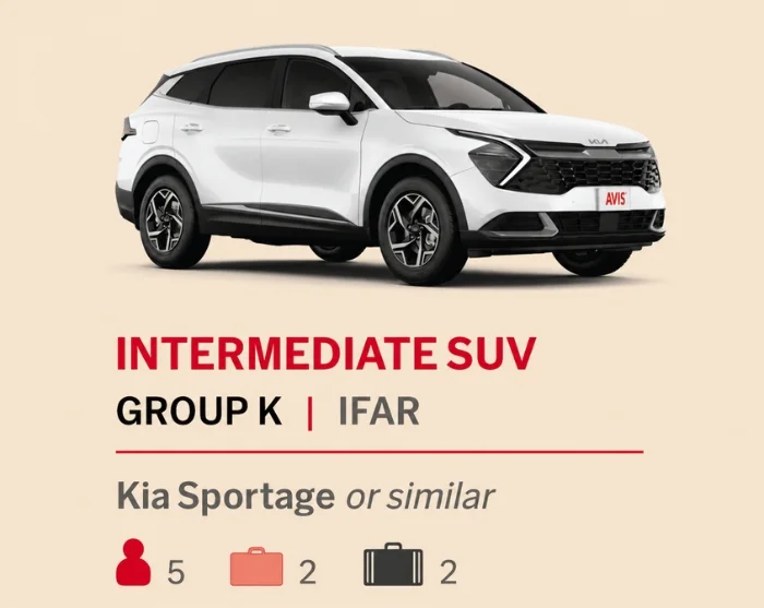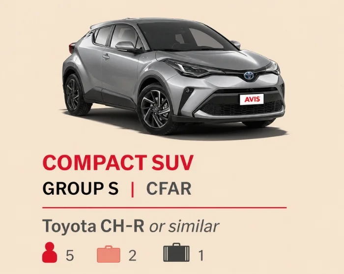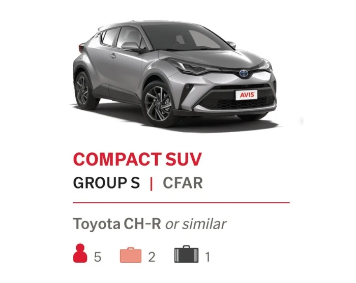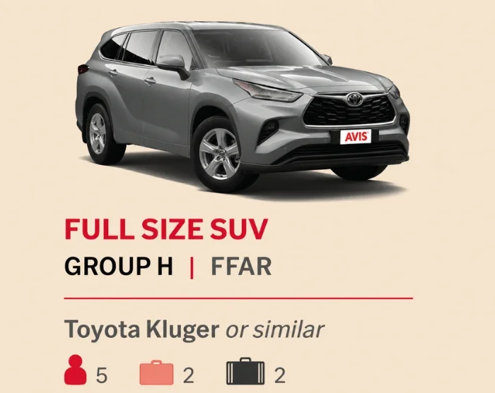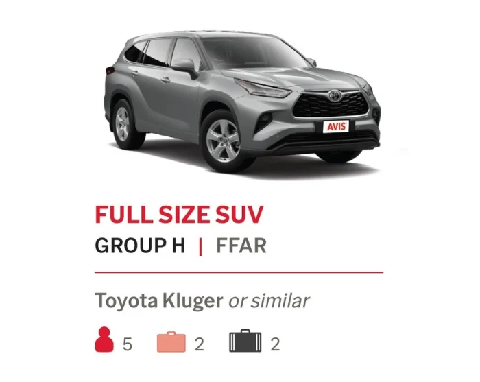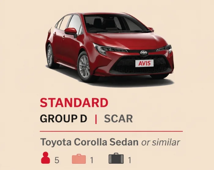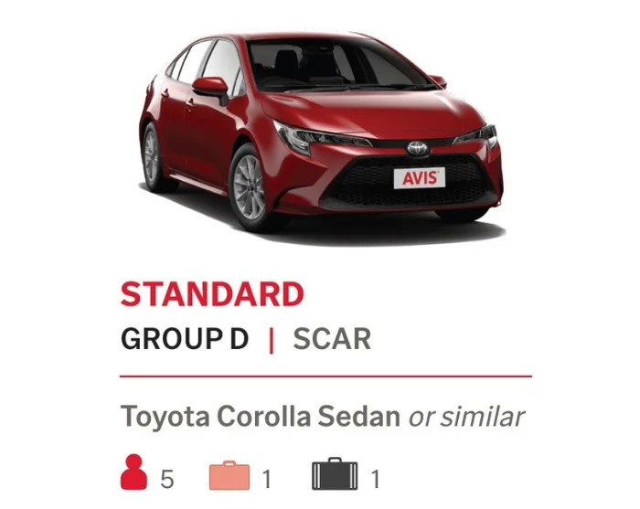 Vi bruger AVIS som biludlejningsfirma i Australien. Som standard inkluderer vi en kategori D – ”standard” Toyota Corolla Sedan eller lignende i din inkluderede billeje, som passer til 1-3 personer med bagage. Det er muligt at opgradere til andre kategorier og modeller, hvis I er flere der rejser sammen eller I blot ønsker en større lejebil.