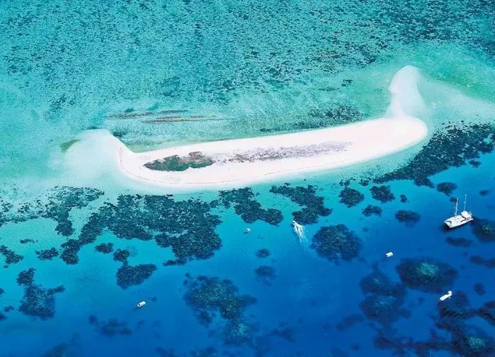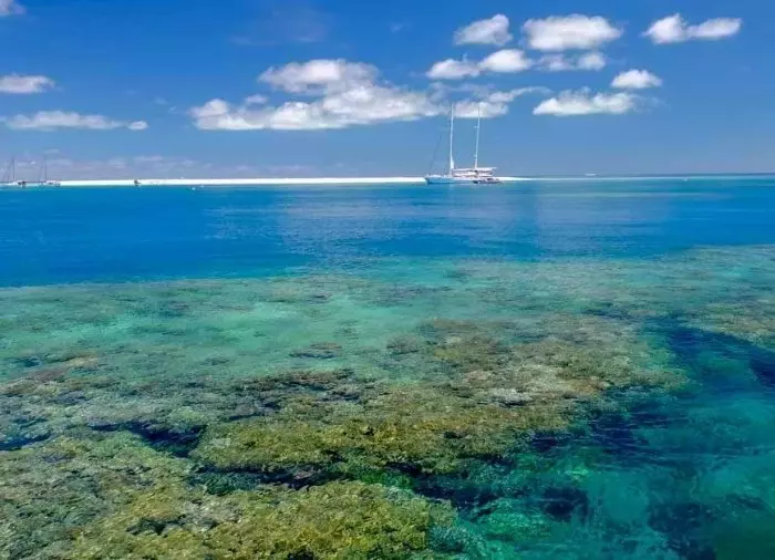 Båden, du sejler med, er en godt 100 fod luksus katamaran, og dagens destination er en sandbanke på det ydre rev, Michaelmas Cay.