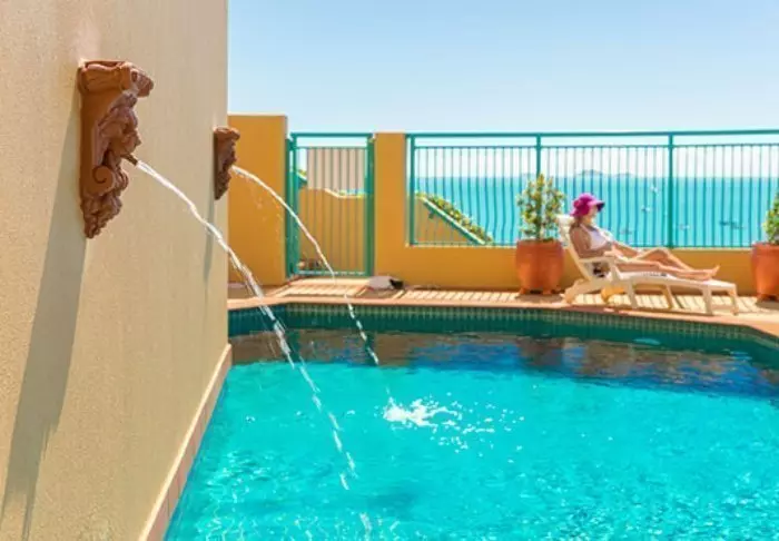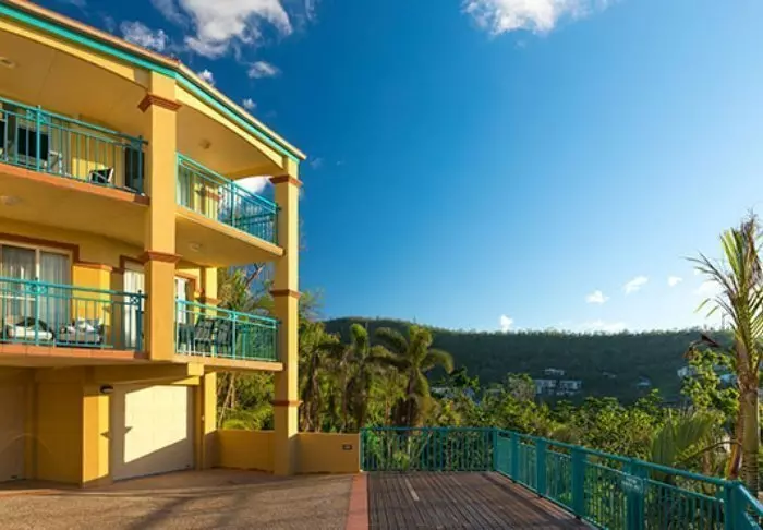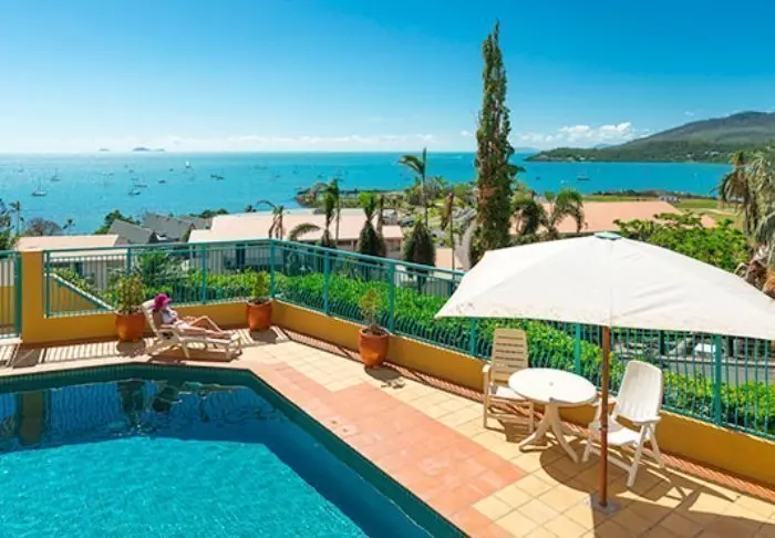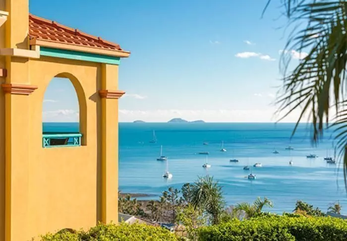 Toscana Village Resort har en fantastisk beliggenhed på en lille bakke med panoramaudsigt ned over byen og Koralhavet med Whitsunday-øerne i baggrunden.