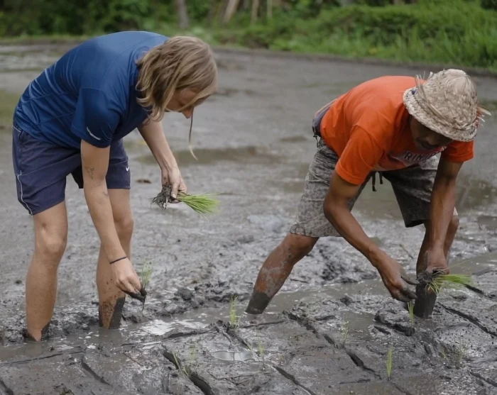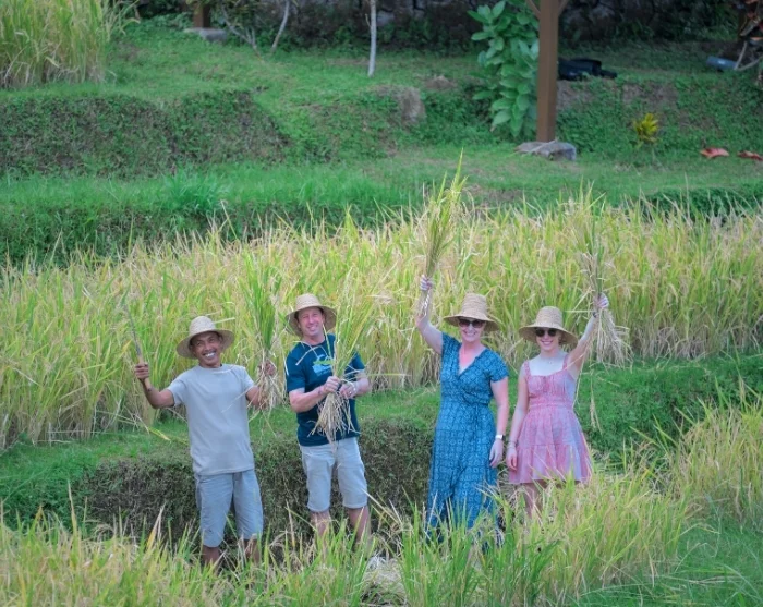 I løbet af dagen følger du ad små stier landmændenes egne ruter ud til de økologiske rismarker. Her møder du bonden, som deler sin personlige historie og fortæller, hvordan økologisk dyrkning er forbundet med balinesisk hinduisme og en dyb respekt for jorden og naturen. Du hører om skiftet fra tidligere dyrkningsmetoder med kemiske sprøjtemidler til en mere bæredygtig tilgang, som igen har bragt liv tilbage til markerne.