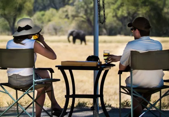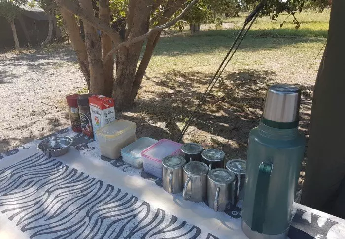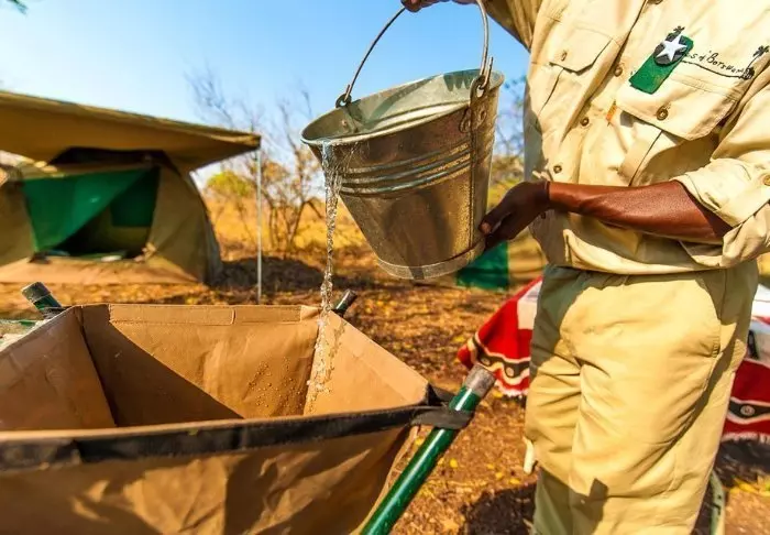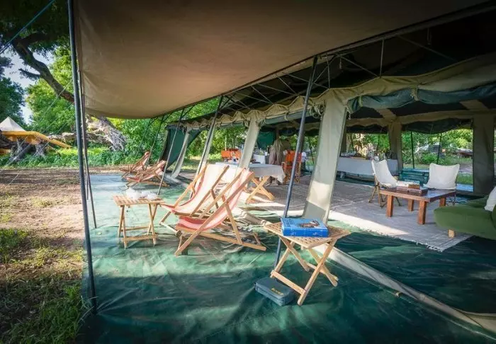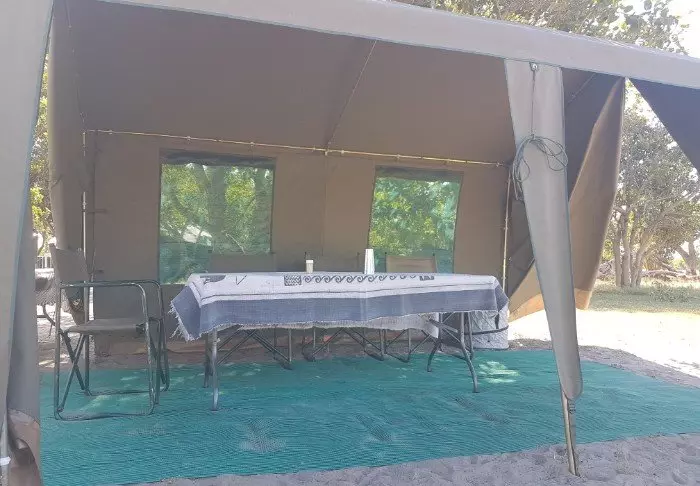 Udenfor teltet er der et lille skyggefuldt overdække med stole, så du kan nyde udsigten til naturen omkring dig. Du sover på en komfortable feltseng med en dejlig blød madras, rigtige dyner og puder og et lille natbord ved siden af. I direkte forlængelse af dit telt, har du dit eget bush-badeværelse med brusebad og toilet. Der er ikke elektricitet eller rindende vand i teltet, og toilettes skyllefunktion består af en bunke jord og en lille skovl – men der ER et toilet! Flere gange om dagen forsynes du med varmt vand og kan vaske dig i et lille bassin, som står i et stativ udenfor teltet. Hvis du har set filmen ”Out of Africa” ved du præcis, hvordan det foregår. Om eftermiddagen bliver der varmet vand, som bliver hejst op i en spand med et brusehoved nedenunder, så du kan få dit dejligt varme brusebad. Det er primitivt, men komfortabelt, og vigtigt af alt; det er overnatning på naturens præmisser, hvor du ikke efterlader nogle spor, mens du kommer helt tæt på dyrelivet i deltaet.