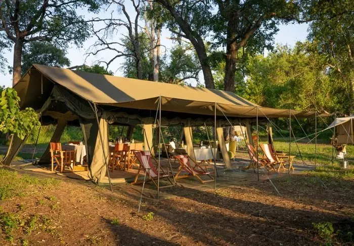 I de to camps, som ligger tæt på hinanden, men alligevel fungerer helt uafhængigt af hinanden, venter tilsammen 14 lækre telte, som alle ER klassiske safaritelte men med (solcelle-)elektricitet, eget badeværelse og privat udendørs bruser med varmt vand. Fra dit telt har du kig til floden eller til den åbne savanne, hvor du kan være heldig at se dyrene komme forbi i løbet af dagen. Måltiderne nydes i det hyggelige messetelt eller under åben himmel, og om natten bliver du næsten med garanti vækket af dyrelyde, der suser lige igennem kanvasvæggene i dit telt.