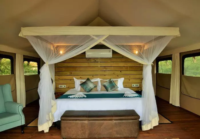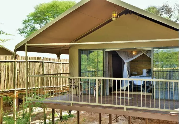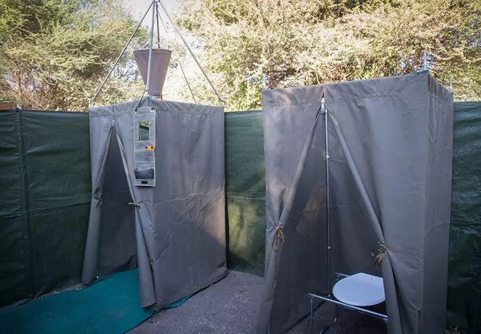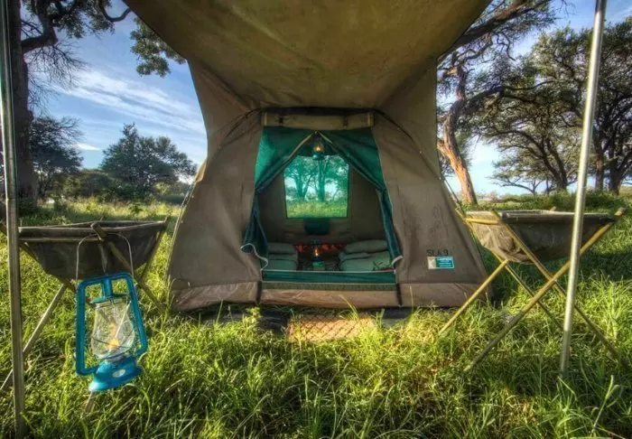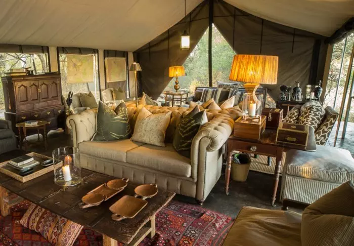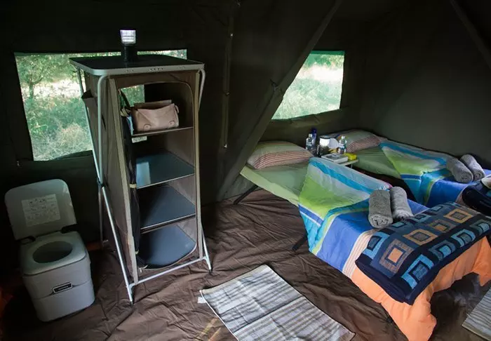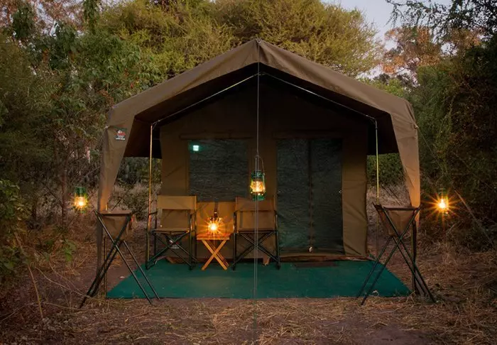 Der er ingen permanente konstruktioner i campen, hvilket er med til at give følelsen af virkelig at være midt naturen, men inde i dit telt føles det som luksus. Midt i teltet står den bløde seng, og du har dit eget badeværelse med rindende vand og indendørs og udendørs bruser. Alle telte er rejst på platforme, og fra de charmerende verandaer er der en flot udsigt over området.