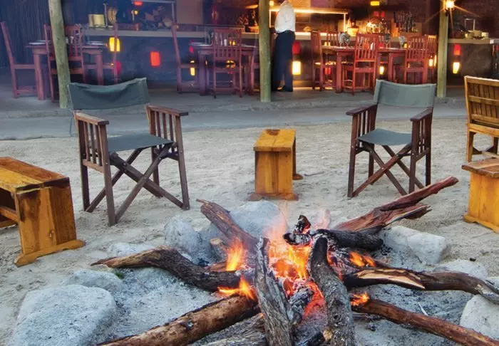 Det virkelige trækplaster på Maun Lodge er bar- og restaurantområdet, som er rigtig hyggeligt. Begge dele er centreret omkring en udendørs bålplads, hvor der er om aftenen ofte bliver tændt bål, så man spiser middag i flammerne skær.