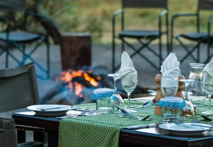 Måltiderne nydes under stjernerne, og maden er god! Frisklavet, smagfuld og mættende – man bliver nemlig utrolig sulten af at være på safari. Der er naturligvis både kolde øl og vin til maden, hvis du ønsker det, og hele dagen er der te og kaffe på kanden.
