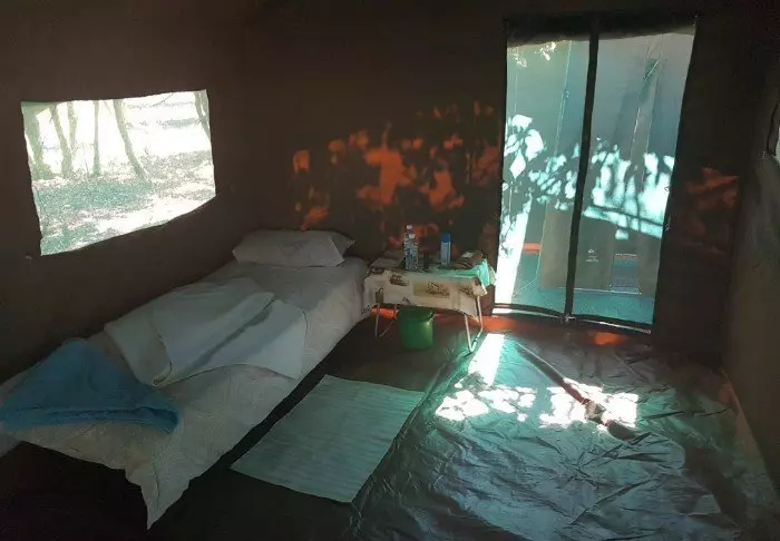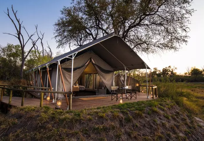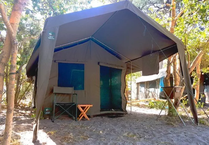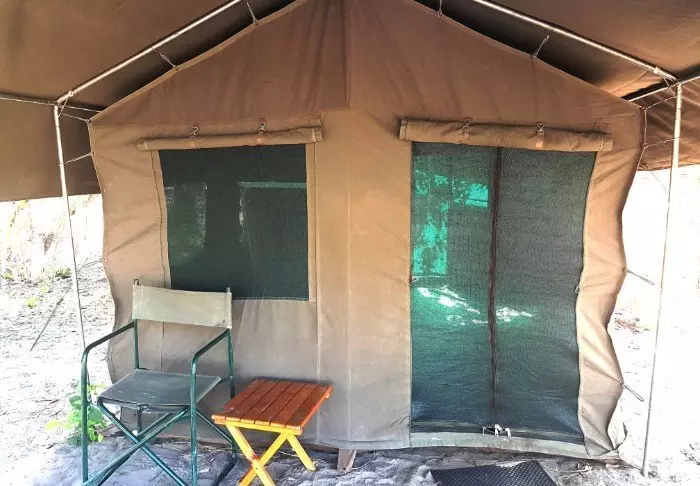 Teltet, du overnatter i, er ca. 12 m² stort og lavet af kraftigt kanvas med store vinduer. Der er ståhøjde, solcellelamper, garderobestativ og naturligvis myggenet for alle vinduer og døre. Udenfor teltet er der et lille skyggefuldt overdække med bord og stole, så du kan nyde udsigten til naturen omkring dig. Du sover på en komfortable feltseng med en dejlig blød madras, rigtige dyner og puder og et lille natbord ved siden af. I direkte forlængelse af dit telt, har du dit eget bush-badeværelse med brusebad og toilet. Der er ikke elektricitet eller rindende vand i teltet, og toilettes skyllefunktion består af en bunke jord og en lille skovl – men der ER et toilet! Flere gange om dagen forsynes du med varmt vand og kan vaske dig i et lille bassin, som står i et stativ udenfor teltet. Hvis du har set filmen ”Out of Africa” ved du præcis, hvordan det foregår. Om eftermiddagen bliver der varmet vand, som bliver hejst op i en spand med et brusehoved nedenunder, så du kan få dit dejligt varme brusebad. Det er primitivt, men komfortabelt, og vigtigt af alt; det er overnatning på naturens præmisser, hvor du ikke efterlader nogle spor, mens du kommer helt tæt på dyrelivet i deltaet.