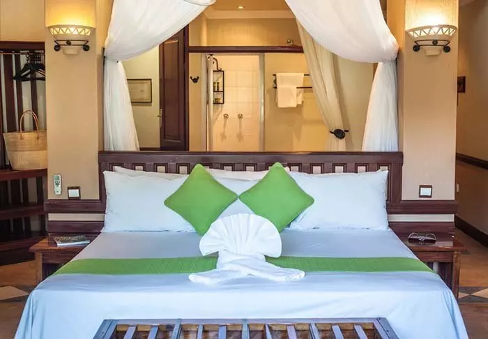 De 60 rummelige værelser har alle aircondition, loftvifte, fladskærms-TV, te- og kaffefaciliteter, køleskab og myggenet over sengene.