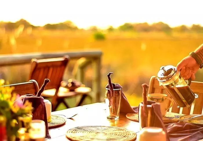 Morgenmaden nydes med udsig til floden – og efter endt safari kan du nyde dagens sidste solstråler fra baren, som også har udsigt mod floden. Det er ganske fortryllende at sidde i det aftagende lys og høre dyrene grynte i den mørke flod.