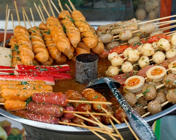 Første stop er et lokalt marked, hvor boderne bugner af friske råvarer. Her handler de lokale ind til dagens måltider, og stemningen er intens og levende. Smag på saftigt, grillet kød og dampende nudelretter, og nyd en kold, lokal øl undervejs.
