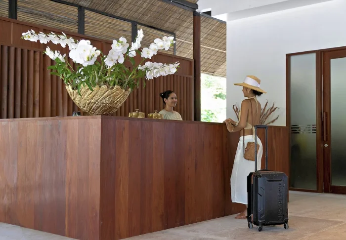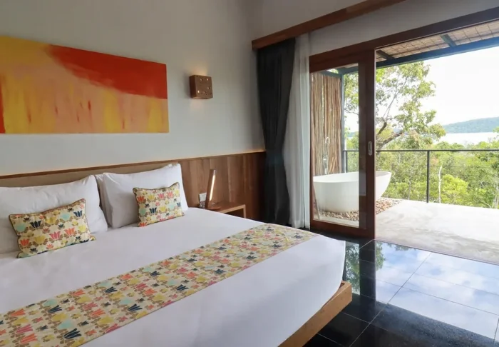 Du bor som udgangspunkt i et Deluxe Hillside-værelse på 52 m2. Værelset ligger hævet i grønne omgivelser bag stranden og giver en rolig og privat ramme om opholdet. Værelset nås via trapper gennem det kuperede terræn og belønner dig med en dejlig udsigt – det er også muligt at tage en buggy til værelset. Det er indrettet i varme træmaterialer med fokus på lys og en afslappet stemning, og de store skydedøre åbner direkte ud til en rummelig terrasse med badekar og udsigt over skov og Saracen Bay i horisonten. Her er god plads til to personer og en stor dobbeltseng eller to enkelt senge, som indbyder til rolige morgener. Værelset er udstyret med aircondition, wi-fi, minibar, kaffe og te faciliteter samt skrivebord. Badeværelset er delvist åbent og giver en særlig naturnær oplevelse. Her finder du både badekar og separat bruser.