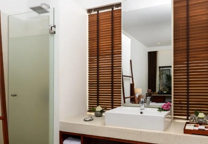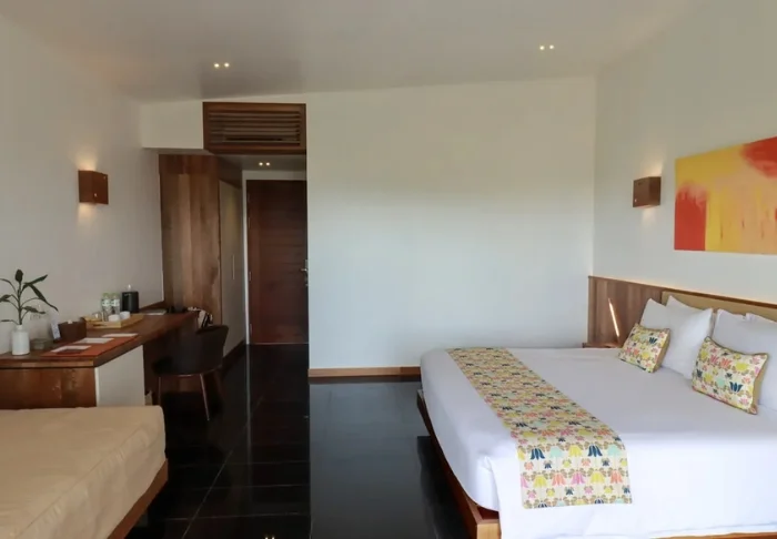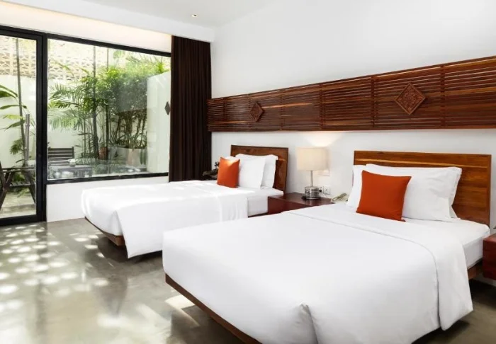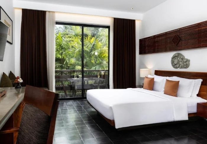 Resortet har i alt 46 værelser, og du bor som standard i et deluxe garden view-værelse med udsigt til den frodige have. Værelset er lyst og indrettet med store vinduespartier, der lukker de grønne omgivelser helt tæt på og giver et smukt kig fra sengen. Indretningen er enkel og varm med mørke træmøbler, khmer-inspirerede detaljer og rolige farvetoner. Værelset har skrivebord, aircondition, gratis wi-fi, fladskærms-tv, minibar, værdiboks samt kaffe- og tefaciliteter. Badeværelset er indrettet med regnbruser, bløde badekåber, slippers og toiletartikler. Derudover har værelset privat terrasse eller balkon, hvor dagen kan begynde i et roligt tempo.