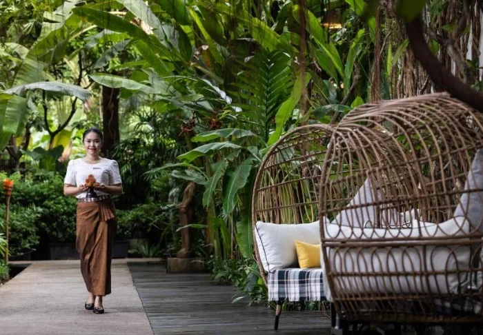 Midt i den grønne gårdhave ligger hotellets pool omgivet af høje træer og tæt beplantning. Her er der god plads til både en svalende dukkert og afslapning i skyggen efter en dag blandt templer og byliv. Trænger du til ekstra forkælelse, tilbyder spaen behandlinger inspireret af lokale traditioner.
