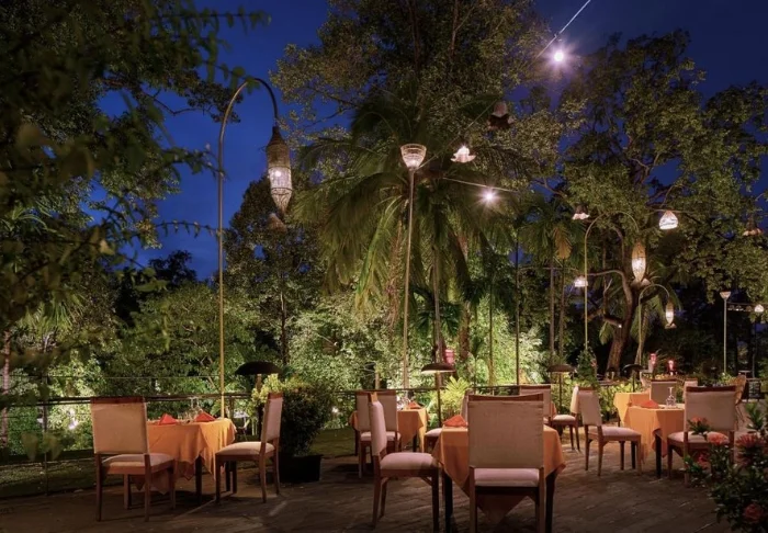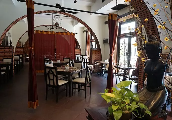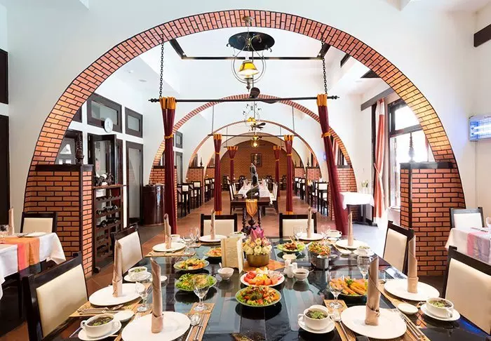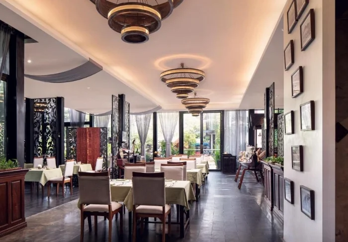 Den hyggelige restaurant ligger på en overdækket terrasse med udsigt til haven og swimmingpoolen. Her fremtrylles både til morgen, middag og aften lækre retter fra det cambodianske og internationale køkken. Et velassorteret vinkort findes også.