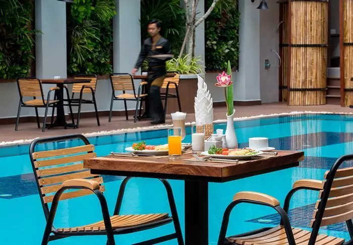 Ved siden af swimmingpoolen finder du hotellets restaurant og bar. Restauranten tilbyder både buffet og a la carte med retter fra både det internationale og cambodianske køkken, mens baren byder på øl, vin, bobler og farverige cocktails.