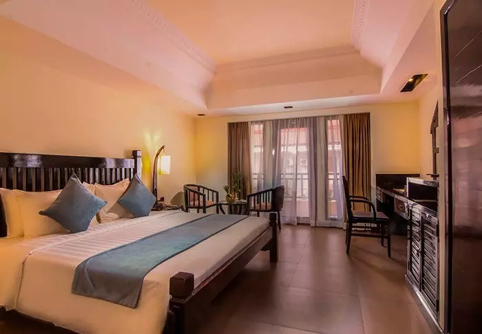 Hotellet har 28 rummelige værelser, og du bor som udgangspunkt i et standardværelse på 1. sal med balkon og udsigt til haven. Værelset er ca. 36 m² og indrettet i en enkel og indbydende stil med cambodjanske håndværksdetaljer, der giver rummet karakter. Alle værelser har store vinduespartier, der sikrer et behageligt lysindfald, samt aircondition, wi-fi, tv, minibar og værdiboks. Derudover er der eget badeværelse med bruser og hårtørrer.