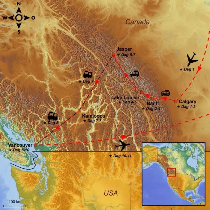 Rejsen starter i westernbyen Calgary, hvor du tilbringer den første nat og kommer dig ovenpå den lange rejse. Efter en formiddag i Calgary afhentes du af din guide og herfra starter eventyret ind i de Canadiske Rocky Mountains – også kendt som de Canadiske Rockies.