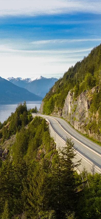 Selvom du på nuværende tidspunkt allerede har kørt på adskillige ikoniske veje, så er dagens rute på knap 1,5 time ingen undtagelse. Fra Whistler kører du på Highway 99 – bedst kendt som ”Sea to Sky Highway”. Som navnet antyder, får du nemlig kontrasten mellem hav og himmelhøjderne at opleve i dag. Fra Whistlers bjerge til dybe fjorde.