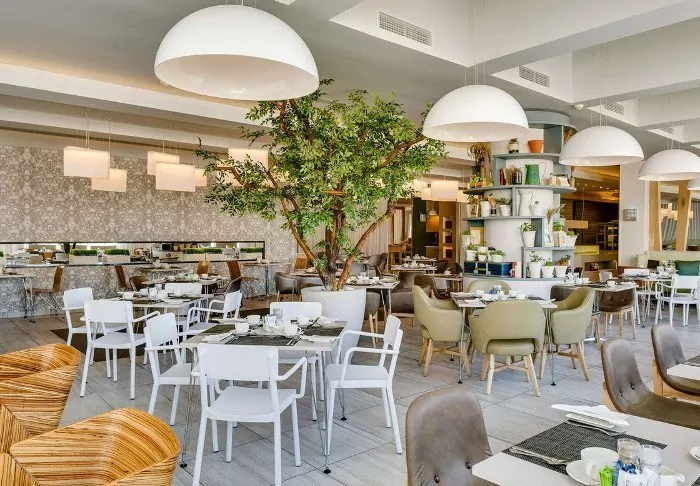 Morgenmaden serveres i restauranten, som også har åbent om aftenen – og hvor værelserne er stilrene og næsten kliniske i deres udtryk, så er det fuld skrald på dekor’en i restauranten. I weekenderne kan du være heldig at opleve lokale bands optræde i restauranten.