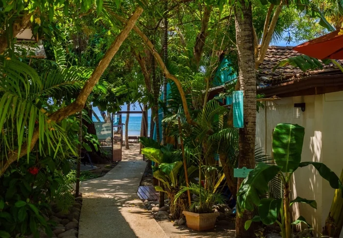 Fra hotellet kan du følge en lille sti langs vandet, som fører dig ind til selve Drake Bay. Turen tager ca. 10–15 minutter til fods og går gennem grønne omgivelser, hvilket giver dig en smuk og autentisk fornemmelse af området – både kystlinjen, landsbyen og den afslappede, lokale livsstil.