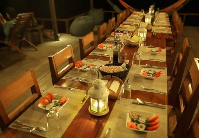 Du kan også nyde omgivelserne fra loungeområdet og restauranten på den store overdækkede veranda, hvor morgenmaden (inkluderet), frokosten og aftensmaden serveres. Aftensmaden er en oplevelse i sig selv, for her står menuen på flere retter, som spises sammen med de andre gæster om et stort bord med rig mulighed for at udveksle dagens oplevelser med hinanden. Bemærk, at aftensmaden reserveres under morgenmaden og ikke er inkluderet.