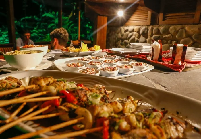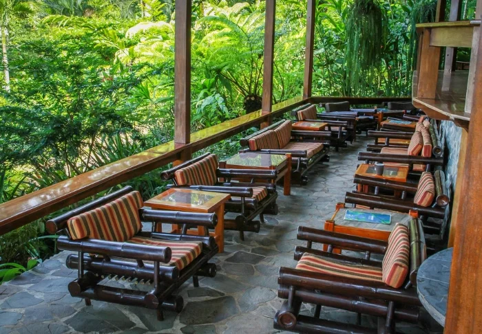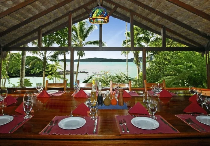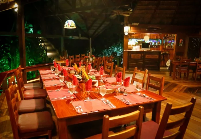 Hotellets restaurant, The Great Room, er et naturligt samlingspunkt. Her serveres retter tilberedt med lokale råvarer – mange af dem fra hotellets egen køkkenhave, La Perla. Køkkenet prioriterer smag, kvalitet og bæredygtighed frem for masseproduktion, og måltiderne nydes i en åben spisestue med udsigt til havet og regnskoven.