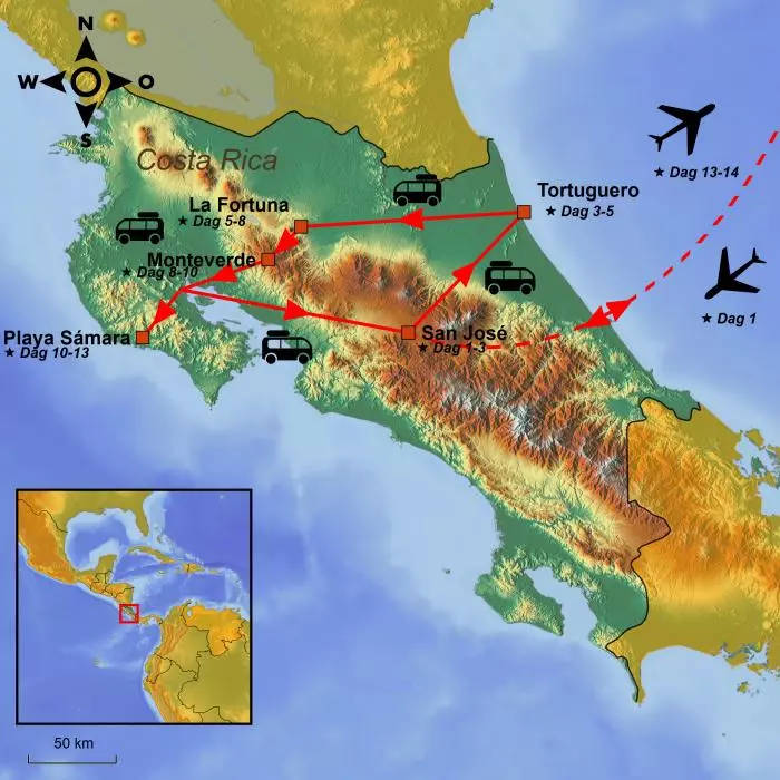 Fra Costa Ricas hovedstad San José går turen mod frodig jungle i Tortuguero Nationalpark. Her kan du være heldig at møde skildpadder, kaimaner, aber, dovendyr, leguaner og en masse fascinerende fugle som f.eks. den flotte tukan med sit farverige næb.