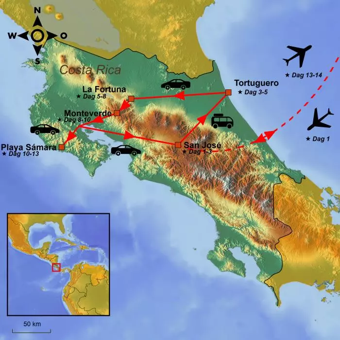 I dag er det blevet tid til at tage afsked med vidunderlige Playa Sámara og Costa Rica. Du kører tilbage til San José og afleverer bilen tæt på lufthavnen. En shuttlebus kører dig fra biludlejningens kontor over til lufthavnen, hvor hjemrejsen mod Danmark starter.