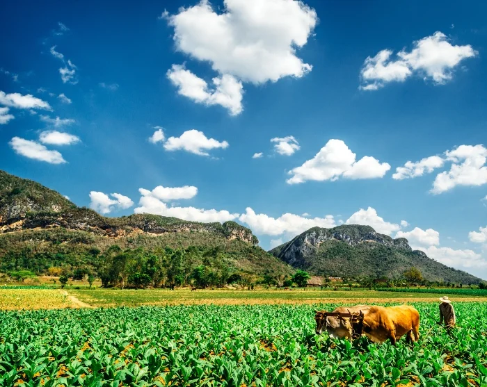 Om eftermiddagen skal du på udflugt til Viñales-dalens højdepunkter. Turen starter med en dejlig frokost på en traditionel cubansk restaurant. Med maven fuld tager din guide dig med ud til en lille tobaksplantage. Her får du et spændende indblik i tobak-bøndernes arbejde med fremstillingen af Cubas verdensberømte cigarer. Viñales-området er faktisk kendt for at have nogle af de bedste tobaksplanter i landet. Det er fra dette område, at tobaksbladene til de berømte cigarmærker Cohiba og Montecristo høstes.