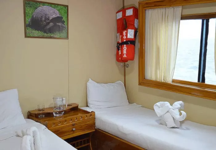 Båden har 9 kahytter med plads til 16 passagerer fordelt på 2 dæk. Kahytterne har enten to enkeltmands- eller en dobbeltseng og er udstyret med eget toilet og aircondition. Vi benytter de kahytter, der ligger på øvre dæk, hvor der er mindst motorstøj.