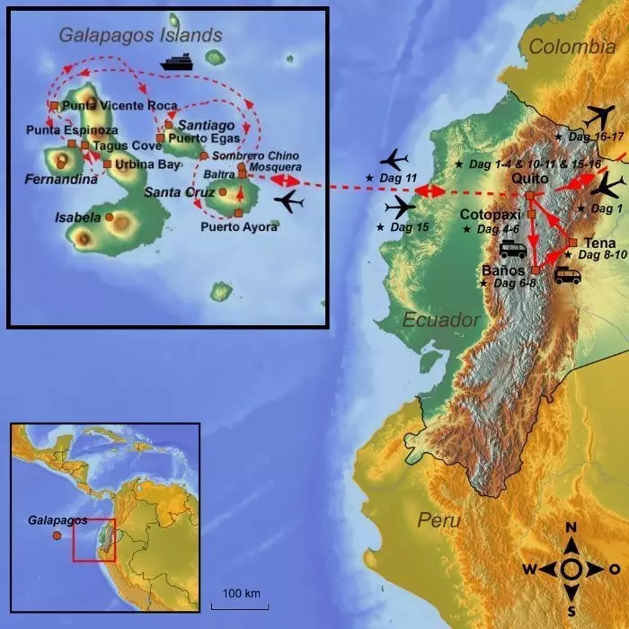 Efter besøget på centeret bliver du kørt i bus tværs over øen til Itabaca-kanalen og sejlet over til lufthavnsøen Baltra, hvorfra du flyver tilbage til Quito. Flyveturen tilbage til Quito tager ofte lidt længere (ca. 2,5-4 timer), da der som regel er en kort mellemlanding i byen Guayaquil.