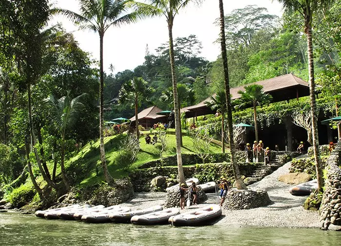 En stejl sti og trappetrin fører ned til Ayung-floden, hvor du bliver instrueret i, hvordan du rafter og hvordan du i øvrigt forholder dig på båden, som har plads til 6 personer plus en certificeret guide. Ombord er der en vandtæt taske, hvori du kan lægge din mobiltelefon, penge mm.