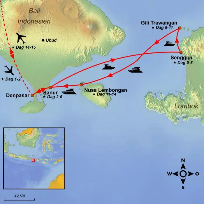 I dag venter den fjerde og sidste ø på rejsen, nemlig den lille paradisø Nusa Lembongan, der ligger sydvest for Gili Trawangan og sydøst for Bali.