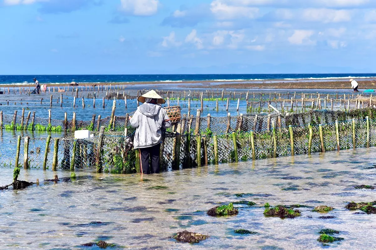 Mange af øens beboere ernærer sig ved dyrkning af havtang. Når tidevandet trækker sig tilbage, dukker tangmarkerne frem, og du vil se bønderne stimle ud i det ankelhøje vand for at plukke dagens høst, der lægges i store flettede kurve, som bæres ind på land, hvor det lægges til tørre i solen.