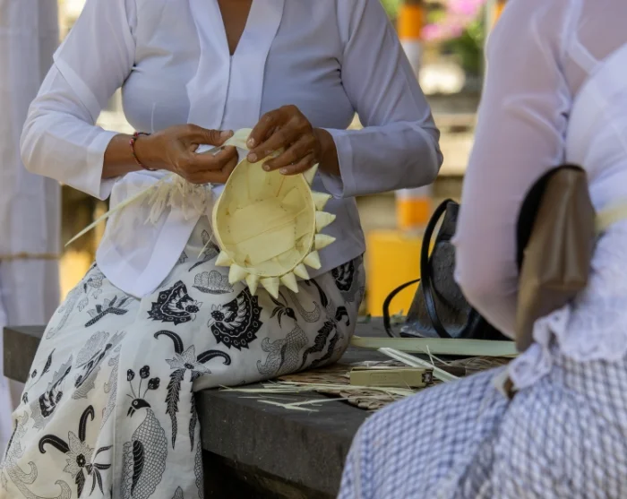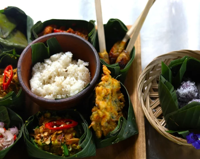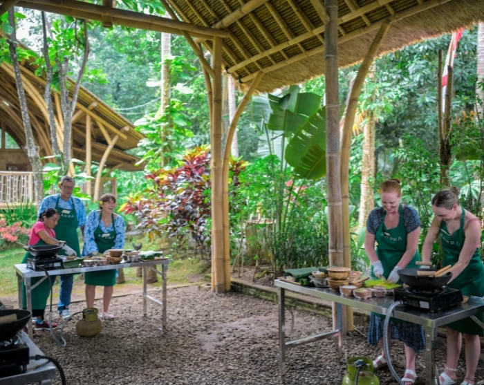 Efter landsbyvandringen vender du tilbage til Kaura, hvor du fortsætter dagen i resortets åbne køkken sammen med en gruppe varme og imødekommende kvinder fra landsbyen. Her lærer du at tilberede klassiske balinesiske retter med friske, lokale råvarer, mens dine værter deler ud af deres opskrifter og fortæller om madens rolle i landsbyens fællesskab. Du får indblik i de teknikker og smage, der er gået i arv gennem generationer, og mærker den glæde og stolthed, der følger med at lave mad sammen.