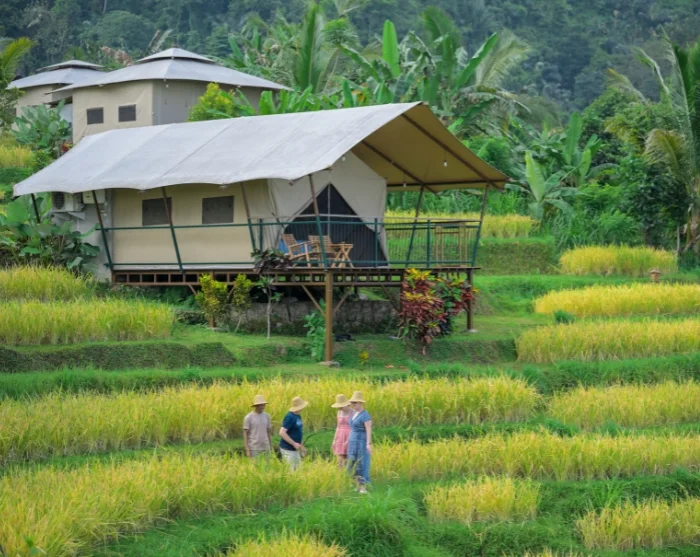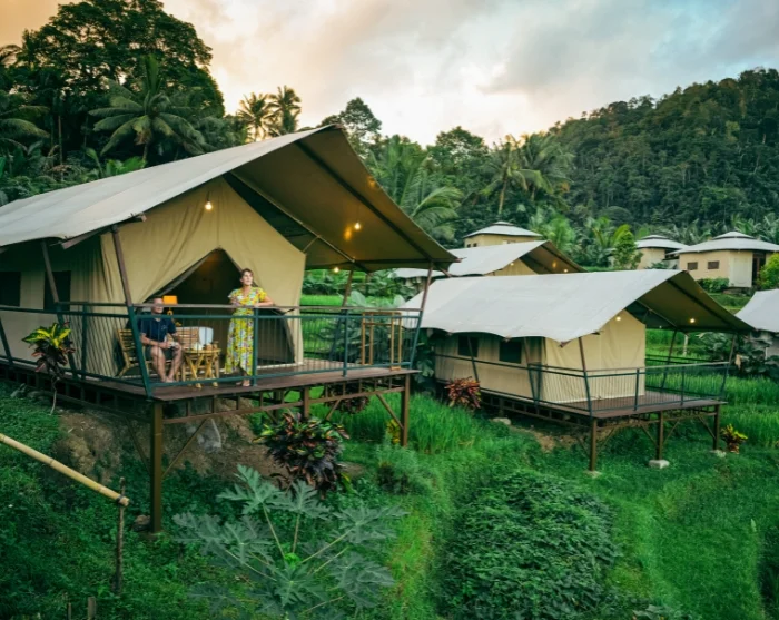 Oplev Ubuds særlige stemning, bo i teltpavillon med udsigt til rismarker og Det Indiske Ocean i Manggis, og rund rejsen af med badeferie i Sanur.