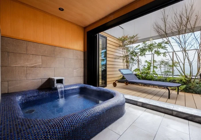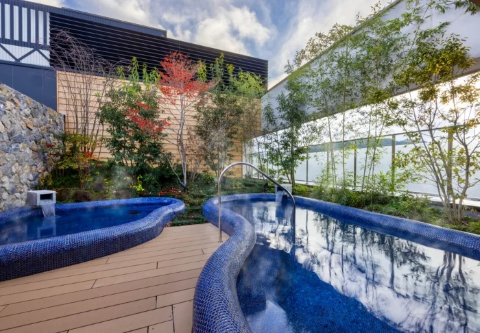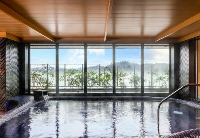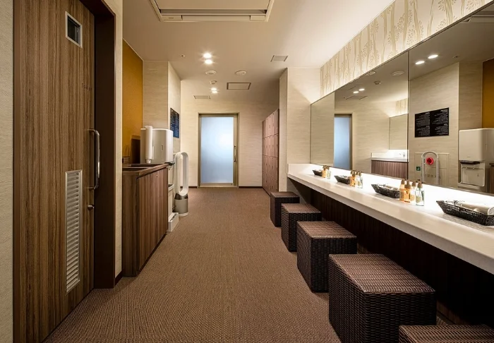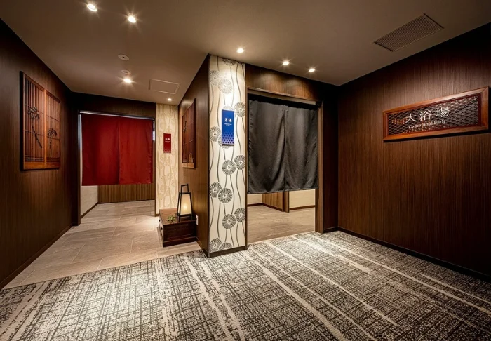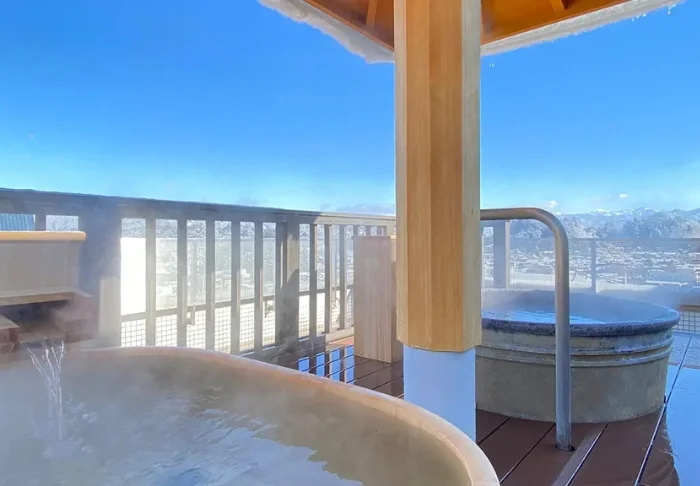 Hotellet råder over flere badeområder, herunder det spektakulære udendørs onsen på hotellets øverste etage, hvor du kan nyde udsigten til De Japanske Alper. Nedenunder findes desuden en sentō, et traditionelt japansk badehus med tatamigulv, ukiyo‑e-kunst på væggene og en afslappende atmosfære. Begge afdelinger tilbyder sauna og gode muligheder for at hvile efter en lang dag.