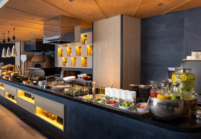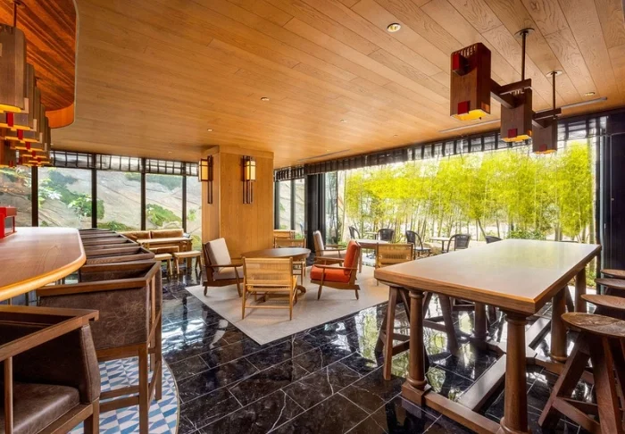 Hotellets indbydende restaurant med høje lofter og store vinduer smukt indrammer årstidernes skiften fra forårets farvepalette til efterårets røde løv. Her venter dig smagfulde valg blandt en mogenbuffet med mere end 25 forskellige retter inspireret af primært det japanske køkken. Vælger du at spise her om aftenen, serveres japanskinspirerede måltider med tilhørende fri drikke (inkl. alkohol) i 90 minutter.