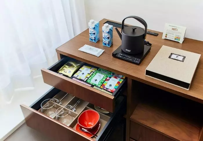 Hotellet har en moderne og stilren indretning med varme toner og japansk minimalisme. Standardværelserne er praktisk indrettet og udstyret med alt, du har brug for efter en dag fuld af indtryk – herunder wi-fi, aircondition, køleskab, tv og elkedel, så du kan starte morgenen med en kop grøn te eller kaffe. Badeværelset er funktionelt og har både toiletartikler og badekar, så du kan slappe af efter en dag på farten.