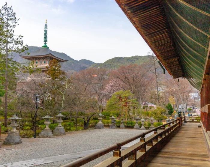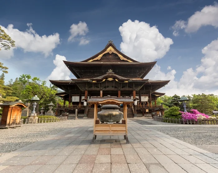 Et oplagt sted at begynde er med en gåtur til Zenko-ji, et af Japans ældste og mest betydningsfulde templer. Her går du ad den brede allé mod tempelpladsen, hvor små butikker sælger røgelse, håndlavede souvenirs og lokale specialiteter. Inde i den imponerende træhal hviler en særlig stemning af stilhed og andagt, kun afbrudt af sagte bønner og den sødligt tunge duft af røgelse. Omkring templet kan du udforske smalle sidegader med caféer og små butikker, hvor hverdagslivet udfolder sig i et afdæmpet tempo. Du kan også fortsætte til Joyama Park, hvor stierne snor sig gennem grønne områder med udsigt til bjergene.