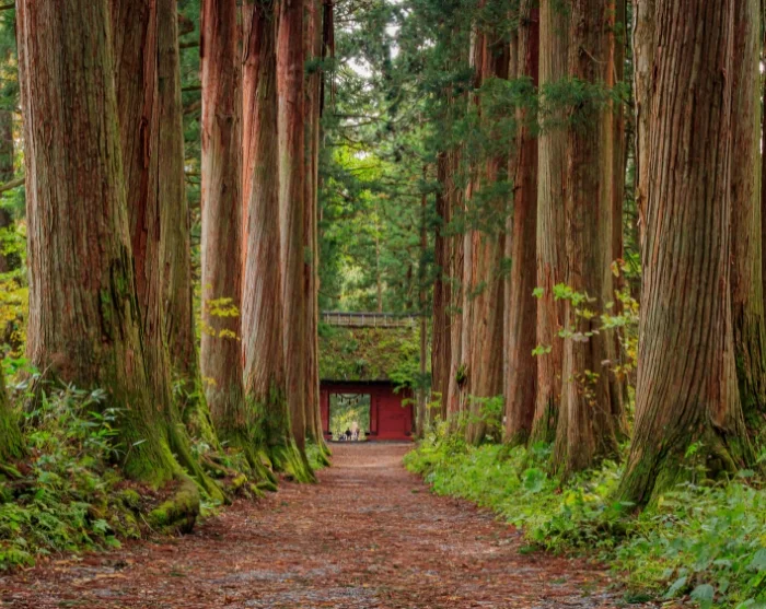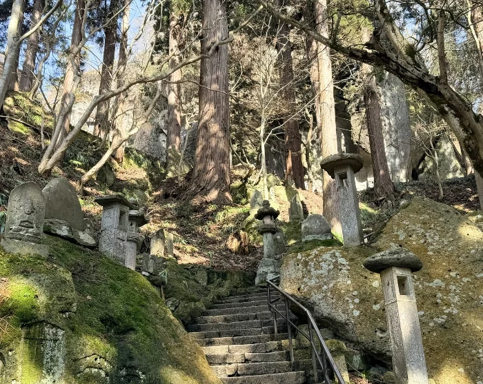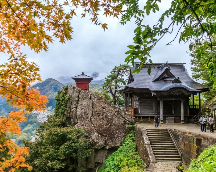 Fra stationen vandrer du op mod Yamadera-templet, der dramatisk klæber sig til bjergsiden. Du følger en sti med flere hundrede stentrin, som gennem århundreder er blevet betrådt af munke og pilgrimme. Trinene snor sig gennem eventyrlige omgivelser med høje cedertræer og en nærmest urokkelig stemning af ro. Undervejs passerer du små mosbelagte helligdomme og udsigtspunkter, hvor du kan trække vejret og lade blikket glide ud over det betagende landskab.