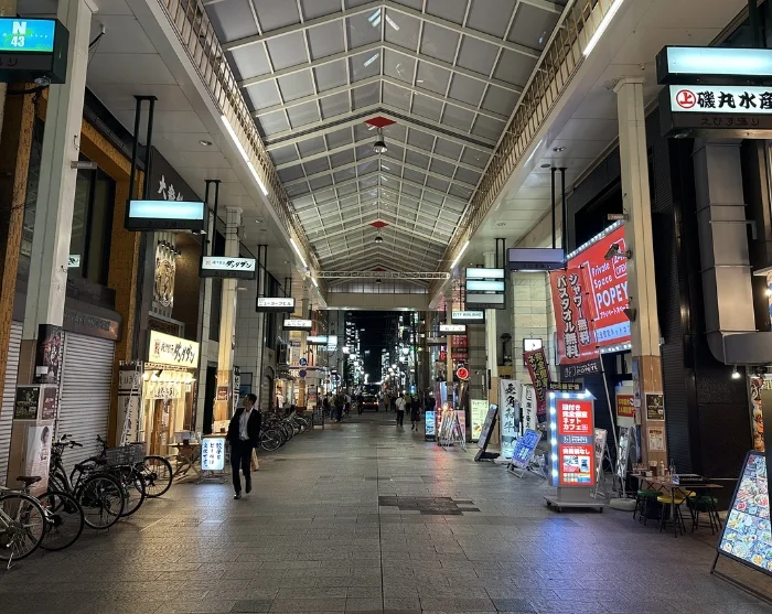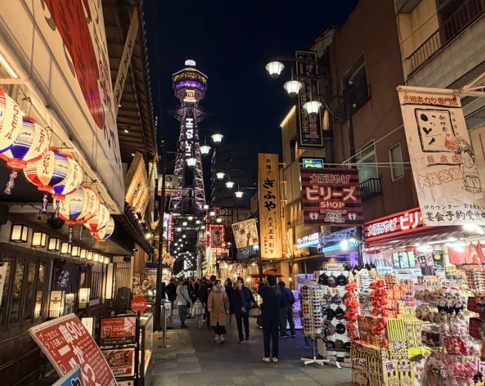 Turen begynder i det charmerende Shinsekai-kvarter, der ved opførelsen før Anden Verdenskrig blev kaldt “Den Nye Verden“. Områdets arkitektur og atmosfære bærer stadig præg af datidens fascination af både Paris og New York, og gaderne byder på en nostalgisk stemning af svundne tider. Her kan du smage de gyldne kushikatsu-spyd i både kød- og grøntsagsudgaver, som er en af byens mest elskede snacks.