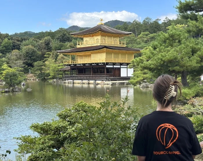 Begynder du dagen tidligt, kan du nå at opleve to af Kyotos mest kendte attraktioner. Med offentlig transport kan du tage turen mod nordvest til det berømte tempel Kinkaku-ji, også kendt som Guldpavillonen. Templets gyldne facade spejler sig smukt i søens rolige overflade og står som et af byens mest ikoniske motiver. Her kan du følge den nøje planlagte rute gennem den tilhørende have, omgivet af årstidens smukke farver.