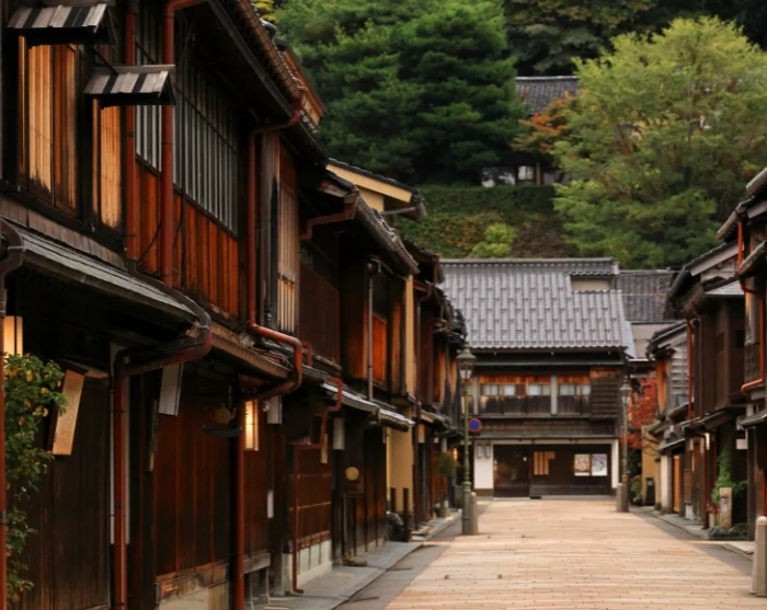 Er energien til det, kan du afslutte dagen med en spadseretur i Kanazawas historiske geishakvarter, Higashi Chaya-distriktet. Når mørket falder på, oplyses de smalle gader blidt af lanterner, og de velbevarede træhuse fra Edo-perioden danner en stemningsfuld ramme om aftenen. Her sænkes tempoet, og den rolige, elegante atmosfære giver en fornemmelse af at træde tilbage i tiden. Måske hører du dæmpet musik bag en skydedør eller ser silhuetten af en geisha på vej til en aftale, mens byen langsomt falder til ro.