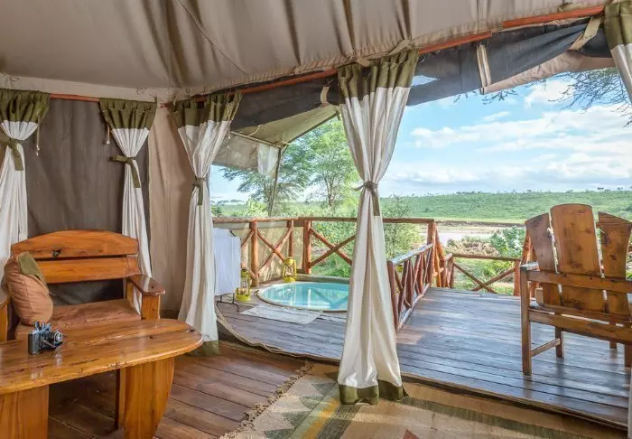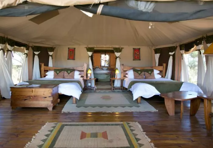 De 12 telte er indrettet efter alle kunstens regler med bløde senge, trægulve, lækre tæpper i flotte farver, god plads til både seng, bord og lænestole i teltene. Alle telte har naturligvis eget badeværelse med rindende (varmt og koldt) vand. Alle telte har egen terrasse, hvor der er en lille plunge pool, som kan køle dig ned på de varme dage.