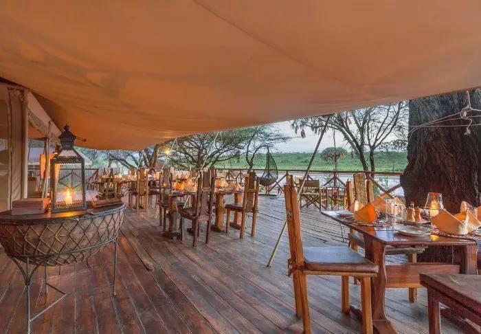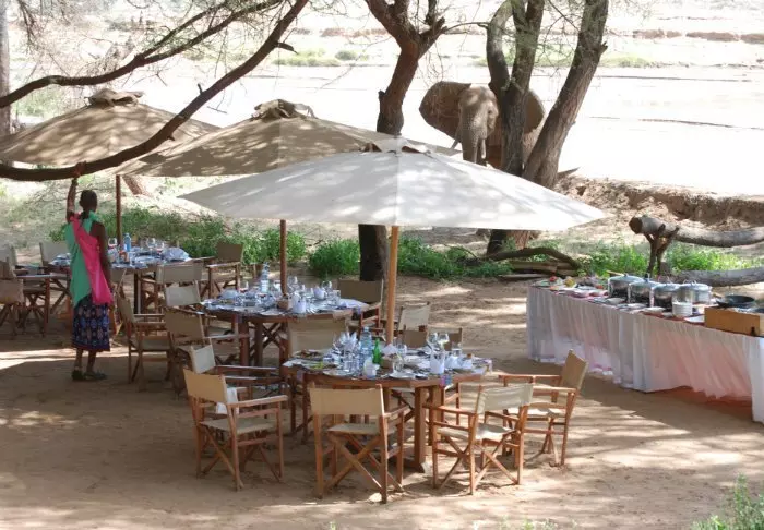 Det helt store trækplaster er campens ”lounge”. Sæt dig i en blød stol, bestil en kold øl og nyd udsigten til floden foran dig. Det er særdeles vanskeligt at komme herfra igen! Heldigvis behøver du ikke gå ret langt for at komme til restauranten – den ligger i et nabotelt i forlængelse af loungen. Maden er fantastisk og hvis du er heldig, bliver frokosten afbrudt af en elefant, som kommer ind i lejren.