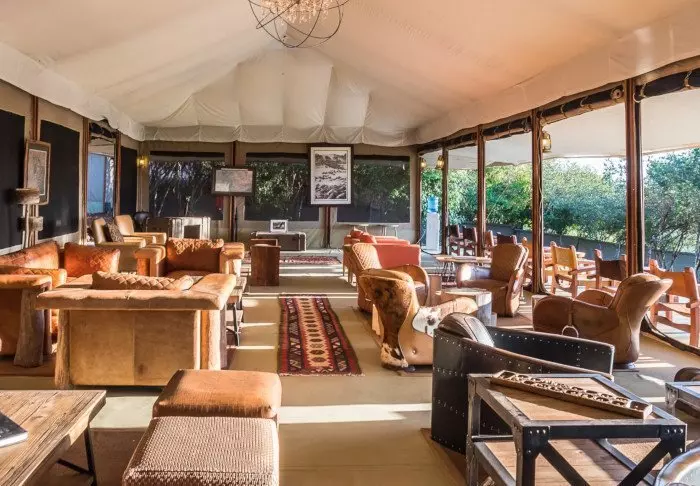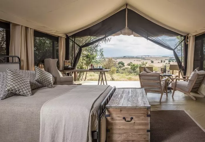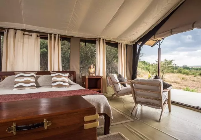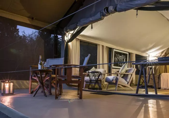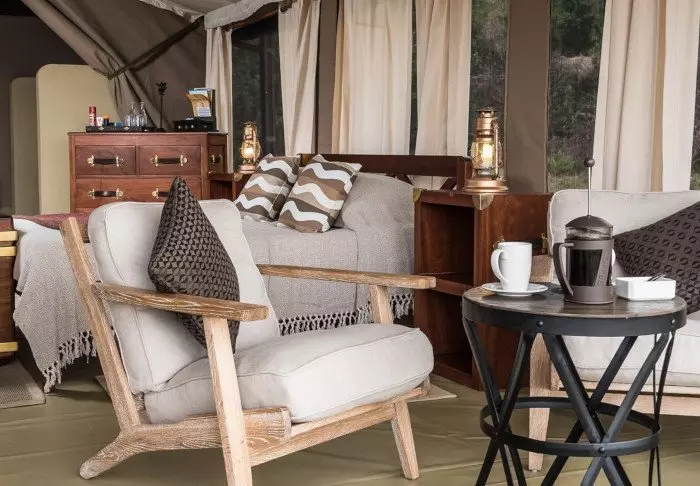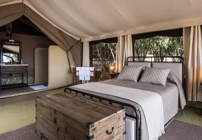 Komforten er til gengæld i top! Teltet er godt nok kanvas, men her er god plads til både borde, stole og den bløde seng og de er alle smukt dekorerede i naturfarver, så man ikke bliver ”forstyrret”. De har naturligvis alle eget bade”værelse” i den bagerste ende af teltet, og der er varmt vand i bruseren. Alle 12 telte har egen veranda med udsigt til sletterne.