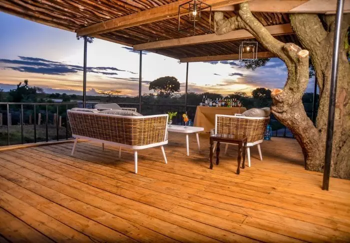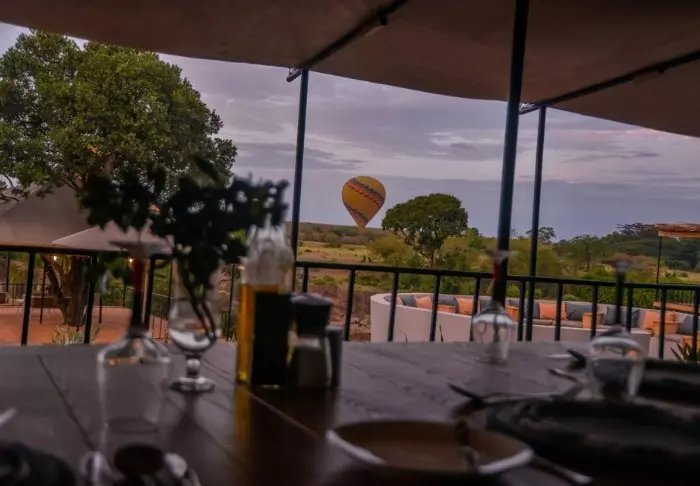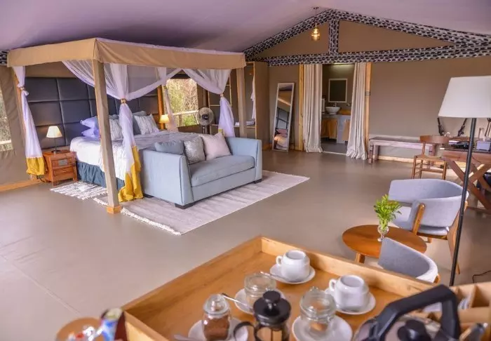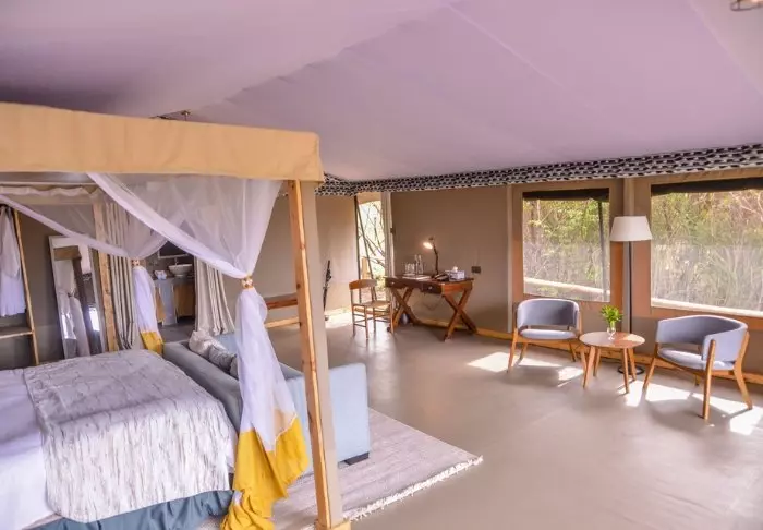 Teltene er som på River Camp, bådpladsen er lige så charmerende med sine farvede puder og en superb udsigt mod Masai Mara og bar og restaurant har samme følelse af luft og lys og plads.