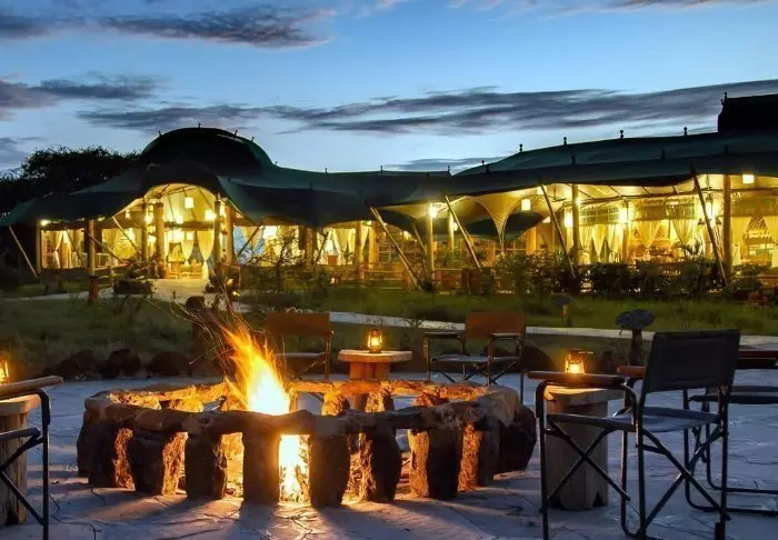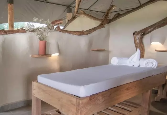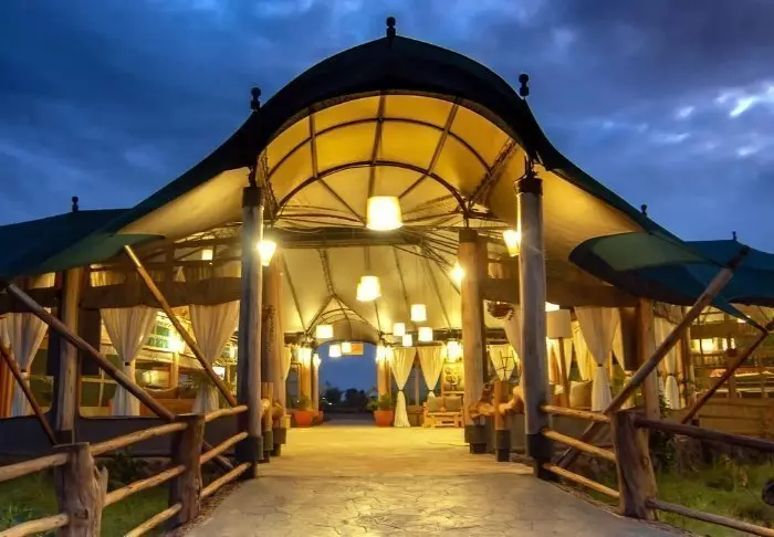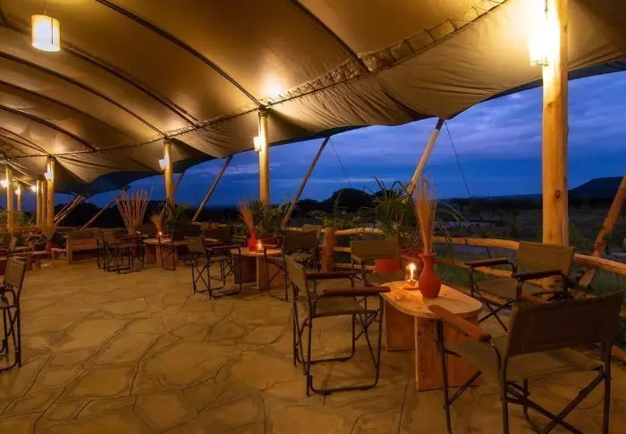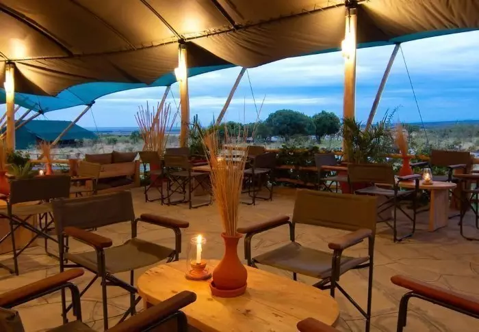 Bar og restaurant indbyder til hygge – her er bløde sofaer og små hyggekroge og er, som teltene, indrettet med god brug af naturlige materiale som træ og sten. Farverne er afdæmpede, så fokus holdes på naturen udenfor.