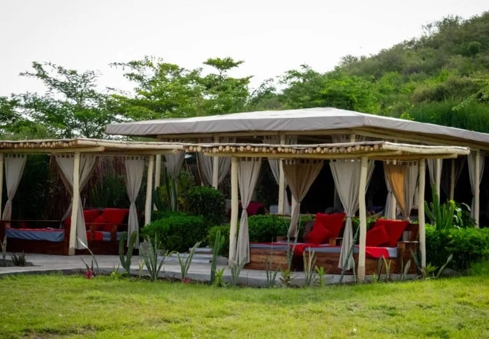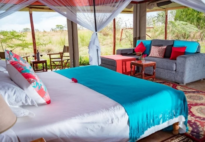 50 i alt – bestående af kanvas – som kan indrettes som single, dobbelt, triple, ja, sågar familietelt, hvis man rejser sammen som familie. De har alle fast gulv, eget badeværelse med varmt og koldt vand i bruseren, myggenet om sengene og store vinduer (bestående af myggenet, som man kan lukke til ved at rulle kanvas for), så du kan nyde den flotte udsigt til sletterne omkring dig. Hvert telt har en lille ”veranda” udenfor med stole og bord, hvorfra du kan nyde udsigten – og måske en god bog.