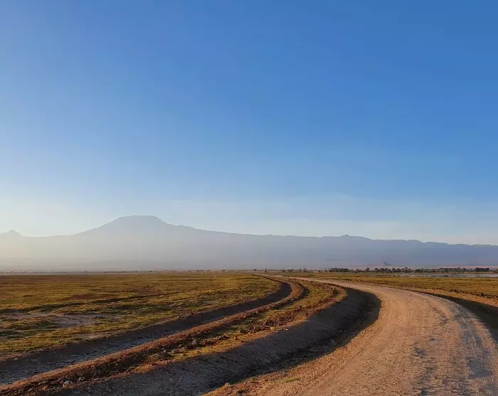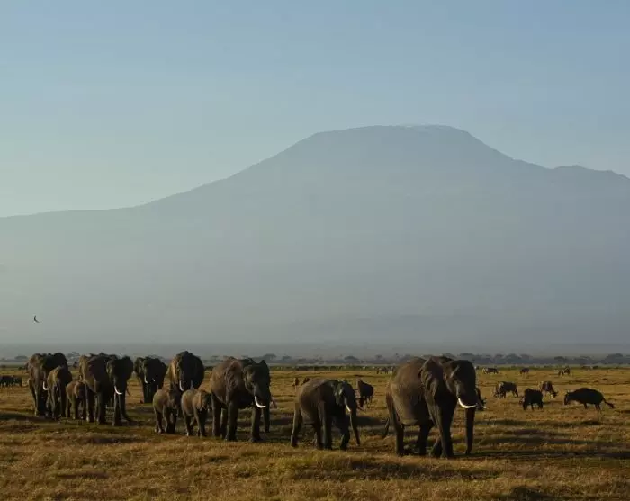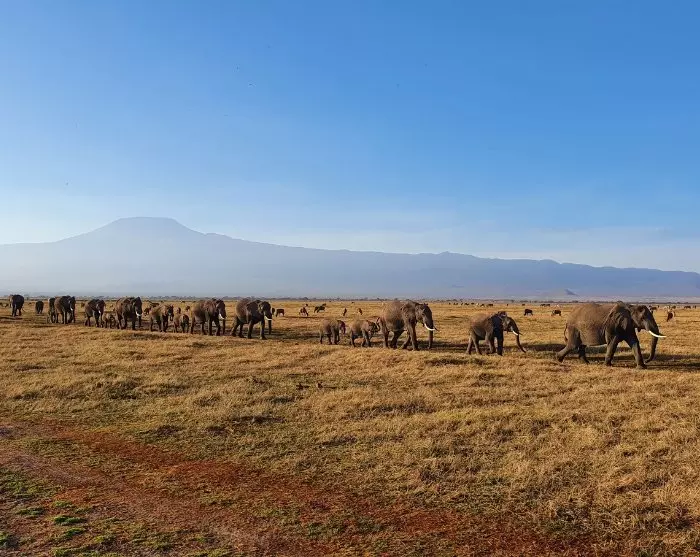 Næsten overalt har du udsigt til Kilimanjaro, som godt nok ligger i Tanzania, men som formodentlig oftere er fotograferet fra Kenya-siden. Det er nemlig her i Amboseli, at du kan være heldig at få det kendte skud af elefanter, som i solnedgangen traver over det pandekageflade landskab for at komme ind i skovene ved foden af Kilimanjaro, hvor de tilbringer natten.